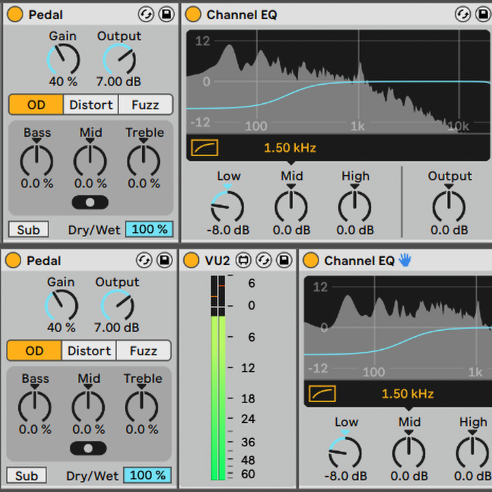 Quand on groupe des effets dans Live, le vu-mètre présent à la fin des effets disparait, VU vous permet d'en ajouter un pour avoir toujours sous les yeux le volume de sortie de chacun de vos effets !